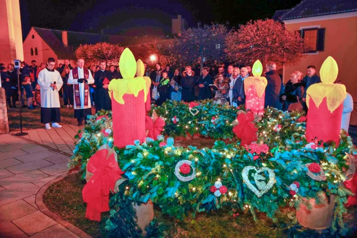 Upaljena prva svijeća na velikom adventskom vijencu ispred župne crkve Ivanec